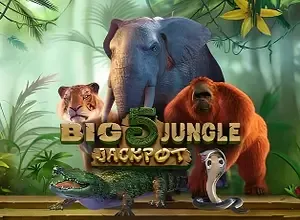 Una civilización perdida en la jungla es el escenario del Big 5 Jungle Jackpot. Con un telón de fondo lleno de vegetación y flanqueado por un par de estatuas en ruinas, los carretes incluyen naipes de piedra del estilo A al 10 junto con serpientes, cocodrilos, orangutanes y elefantes.